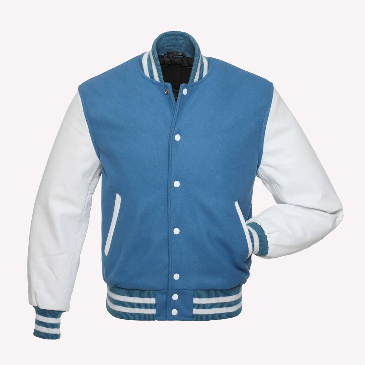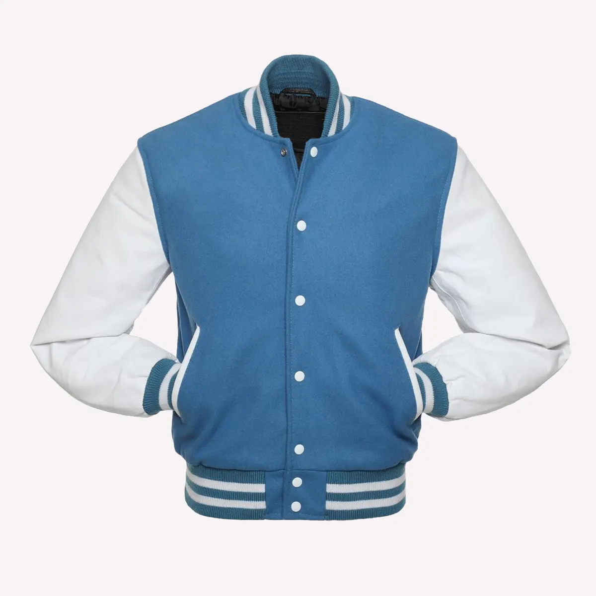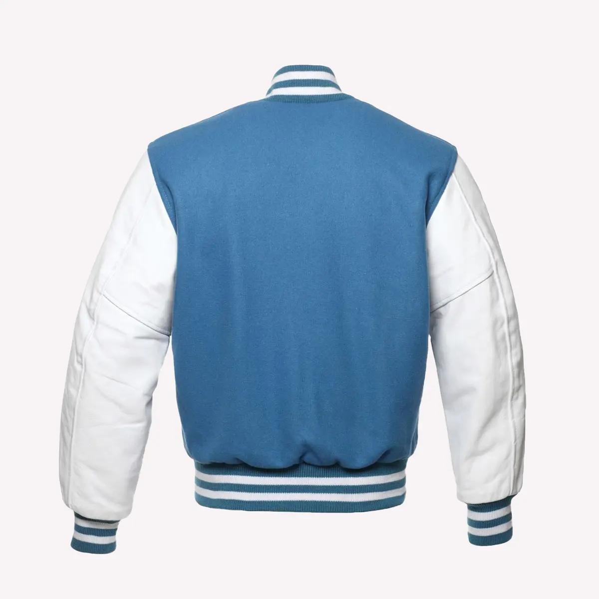 Light Blue Wool Body & Bright White Leather Sleeves Letterman Varsity Jacket